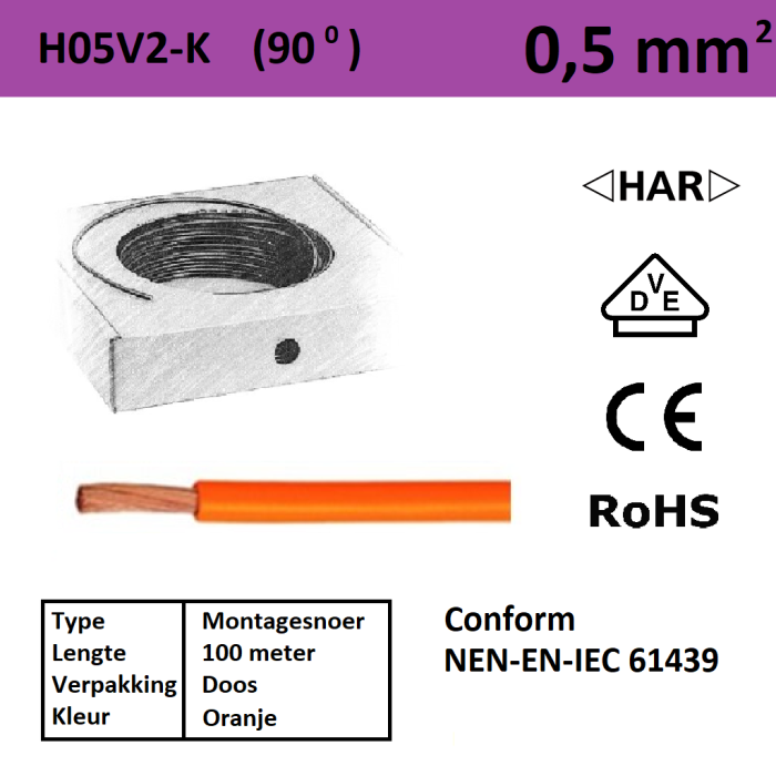 SEP H05V2-k montagesnoer; 0,5mm2; Oranje; doos 100mtr