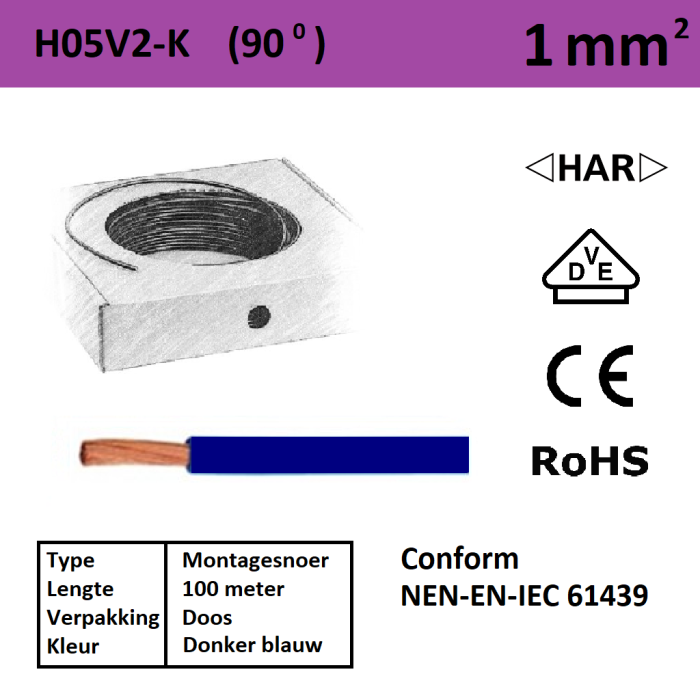 SEP H05V2-k montagesnoer; 1mm2; Donker Blauw; doos 100mtr