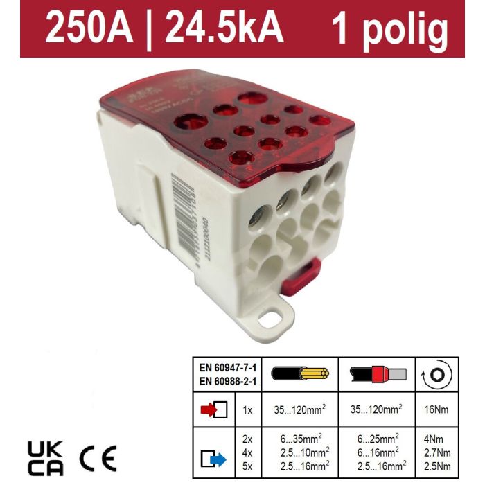 SEP Enkelpolig verdeelblok 250A (IN 1x120mm2, OUT 2x35mm2 + 5x16mm2 +4x10mm2)