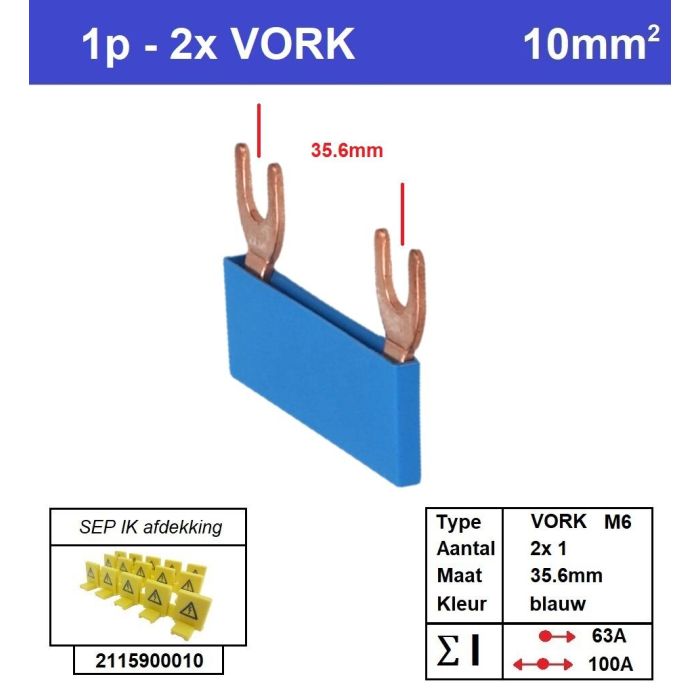 Geïsoleerde doorverbindingskam, 1 fase, 2x VORK, M6, 10mm2, 35,6mm, blauw