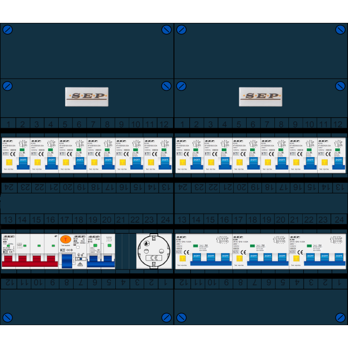 SEP FS groepenkast, hoofdschakelaar 4p/40A, 12x aardlekautomaat 1p+n/B16/30mA, 1x als+installatieautomaat 2p+2n/B16, 3x aardlekautomaat 3p+n/B16/30mA, enkelvoudige contactdoos (3 Fase)