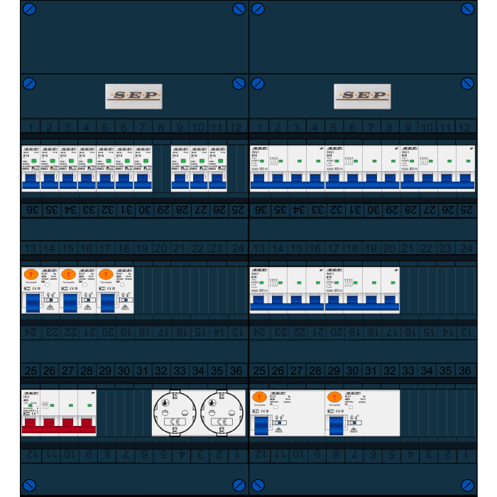 SEP FS groepenkast, hoofdschakelaar 4p/40A, 3x aardlekschakelaar 2p/40A/30mA, 2x aardlekschakelaar 4p/40A/30mA, 10x installatieautomaat 2p+n/B16, 5x installatieautomaat 4p/B16, tweevoudige contactdoos (3 Fase)