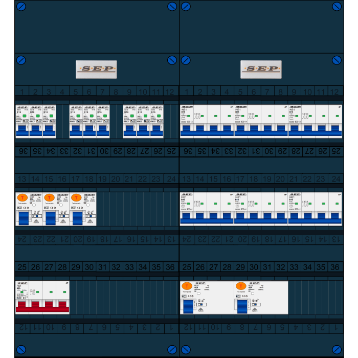 SEP FS groepenkast, hoofdschakelaar 4p/40A, 3x aardlekschakelaar 2p/40A/30mA, 2x aardlekschakelaar 4p/40A/30mA, 9x installatieautomaat 2p+n/B16, 6x installatieautomaat 4p/B16 (3 Fase)