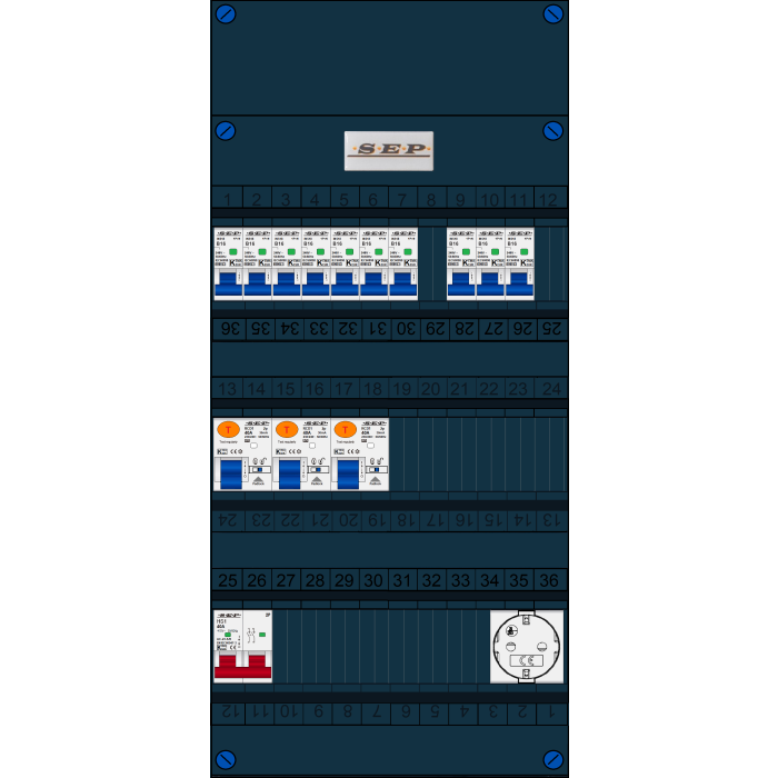 SEP FS groepenkast, hoofdschakelaar 2p/40A, 3x aardlekschakelaar 2p/40A/30mA, 10x installatieautomaat 1p+n/B16, 1x Wandcontactdoos (1 fase)