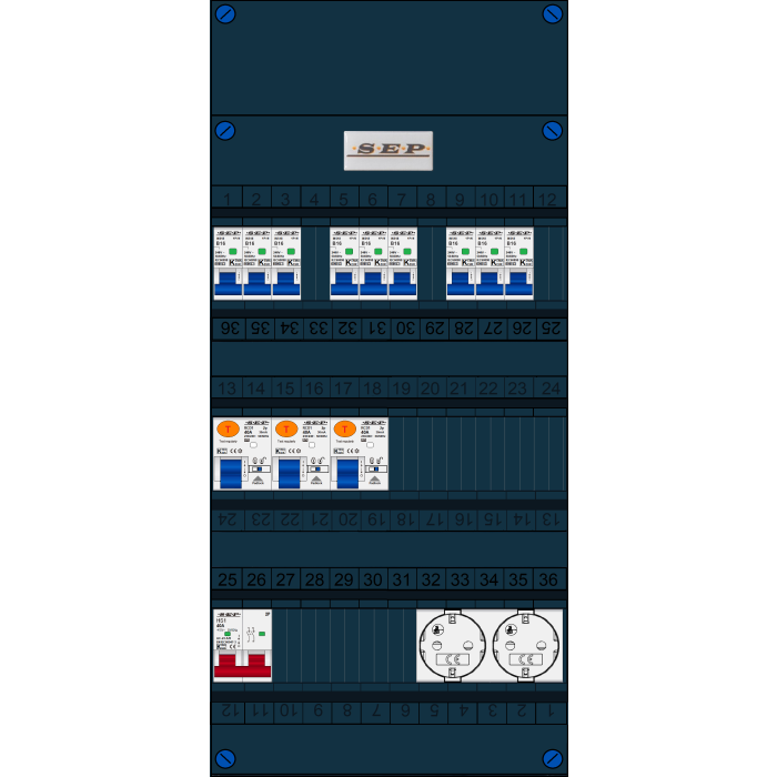 SEP FS groepenkast, hoofdschakelaar 2p/40A, 3x aardlekschakelaar 2p/40A/30mA, 9x installatieautomaat 1p+n/B16, 2x Wandcontactdoos (1 fase)