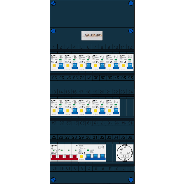 SEP FS groepenkast, hoofdschakelaar 4p/40A, 11x aardlekautomaat 1p+n/B16/30mA, 1x aardlekautomaat 3p+n/B16/30mA, enkelvoudige contactdoos (3 Fase)
