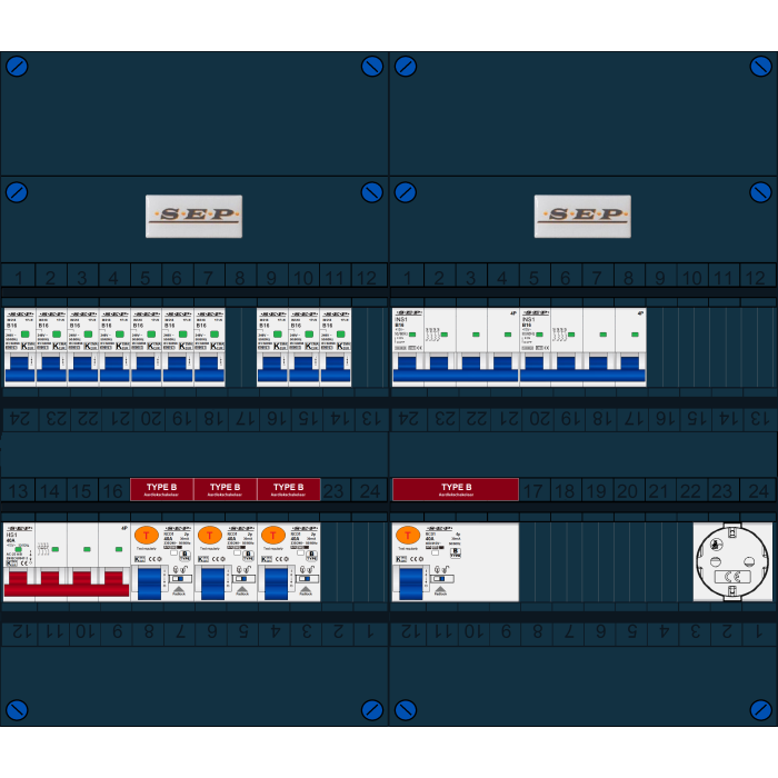 SEP FS groepenkast, hoofdschakelaar 4p/40A, 3x aardlekschakelaar 2p/40A/30mA (Type B), 1x aardlekschakelaar 4p/40A/30mA (Type B), 10x installatieautomaat 1p+n/B16, 2x installatieautomaat 4p/B16, enkelvoudige contactdoos (3 fase)