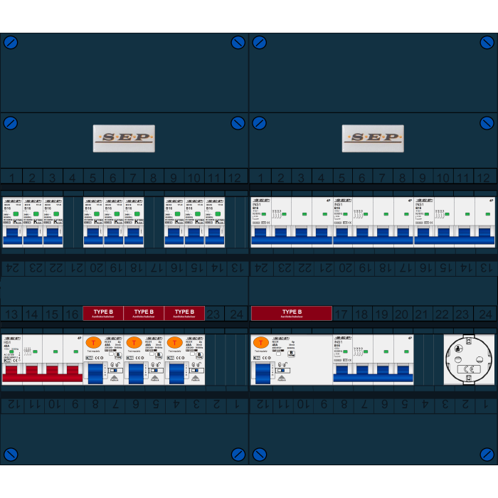 SEP FS groepenkast, hoofdschakelaar 4p/40A, 3x aardlekschakelaar 2p/40A/30mA (Type B), 1x aardlekschakelaar 4p/40A/30mA (Type B), 9x installatieautomaat 1p+n/B16, 4x installatieautomaat 4p/B16, enkelvoudige contactdoos (3 fase)