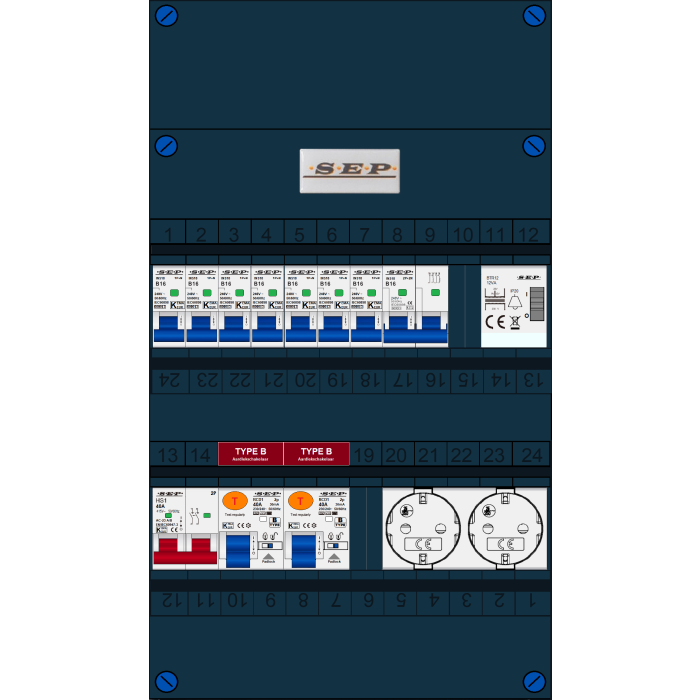 SEP FS groepenkast, hoofdschakelaar 2p/40A, 2x aardlekschakelaar 2p/40A/30mA (Type B), 7x installatieautomaat 1p+n/B16, 1x installatieautomaat 2p+2n/B16, beltrafo, tweevoudige contactdoos (1 fase)
