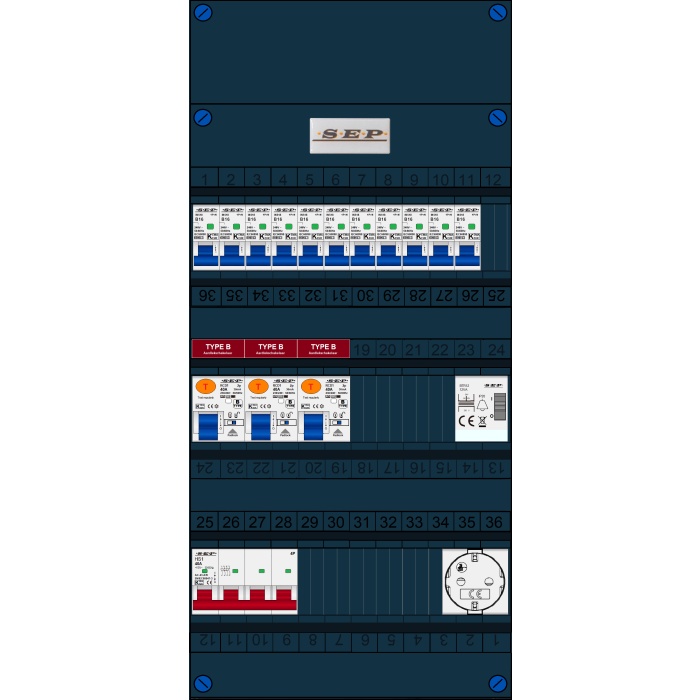 SEP FS groepenkast, hoofdschakelaar 4p/40A, 3x aardlekschakelaar 2p/40A/30mA (Type B), 11x installatieautomaat 1p+n/B16, beltrafo, enkelvoudige contactdoos (3 fase)