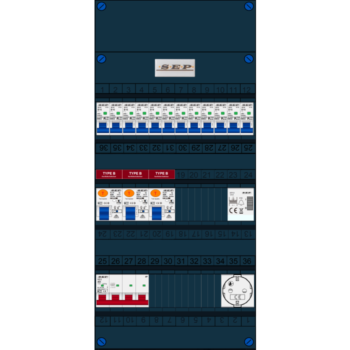 SEP FS groepenkast, hoofdschakelaar 4p/40A, 3x aardlekschakelaar 2p/40A/30mA (Type B), 12x installatieautomaat 1p+n/B16, beltrafo, enkelvoudige contactdoos (3 fase)