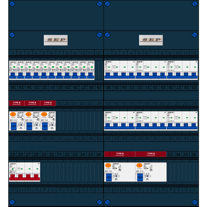 SEP FS groepenkast, hoofdschakelaar 4p/63A, 3x aardlekschakelaar 2p/63A/30mA (Type B), 2x aardlekschakelaar 4p/63A/30mA (Type B), 11x installatieautomaat 1p+n/B16, 6x installatieautomaat 4p/B16 (3 fase)