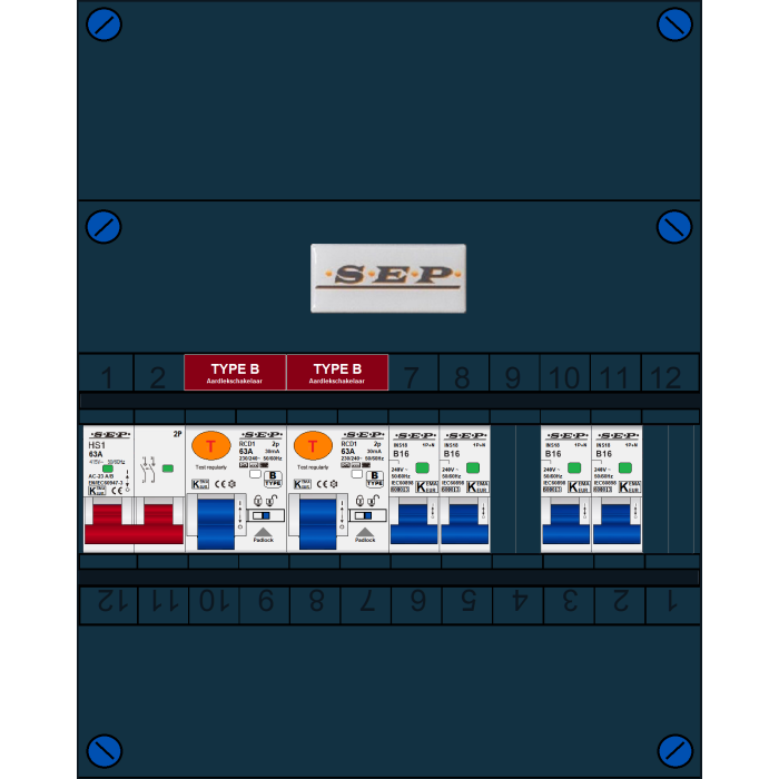 SEP FS groepenkast, hoofdschakelaar 2p/63A, 2x aardlekschakelaar 2p/63A/30mA (Type B), 4x installatieautomaat 1p+n/B16 (1 fase)
