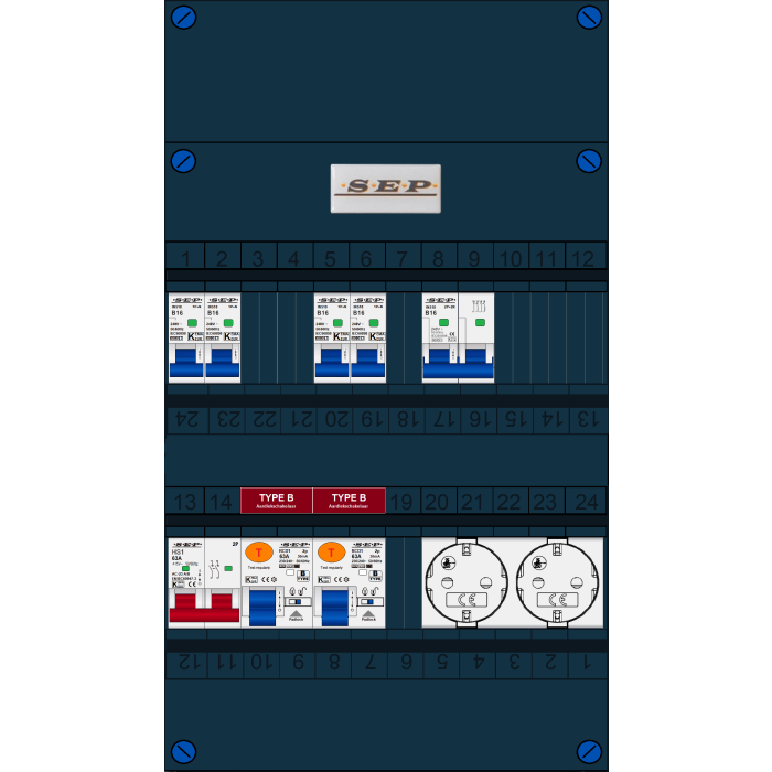 SEP FS groepenkast, hoofdschakelaar 2p/63A, 2x aardlekschakelaar 2p/63A/30mA (Type B), 4x installatieautomaat 1p+n/B16, 1x installatieautomaat 2p+2n/B16, tweevoudige contactdoos (1 fase)