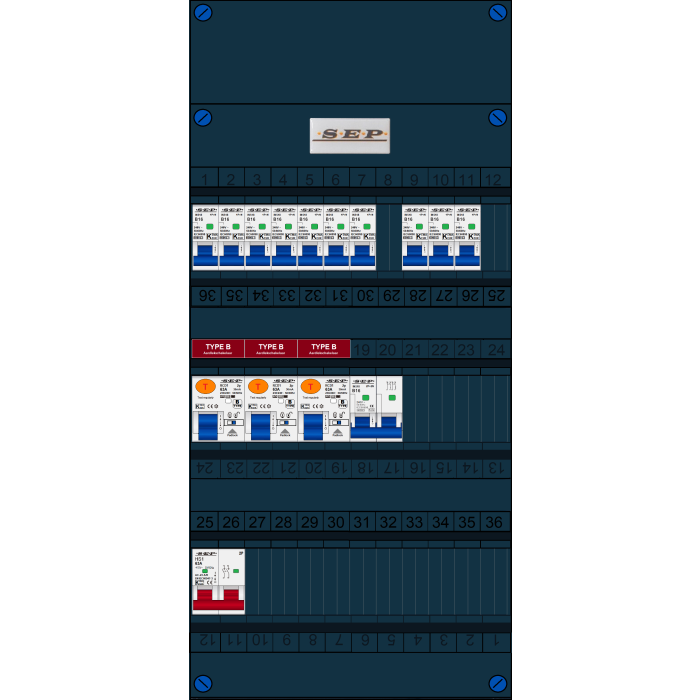 SEP FS groepenkast, hoofdschakelaar 2p/63A, 3x aardlekschakelaar 2p/63A/30mA (Type B), 10x installatieautomaat 1p+n/B16, 1x installatieautomaat 2p+2n/B16 (1 fase)
