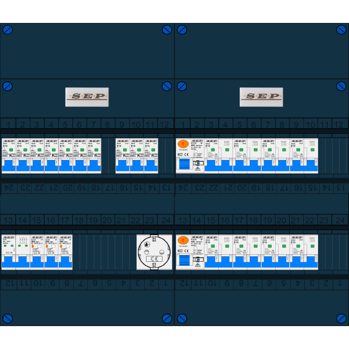 SEP groepenkast, hoofdschakelaar, 3x aardlekschakelaar 2p/40/30mA, 2x aardlekschakelaar 4p/40A/30mA, 10x installatieautomaat 1p+n/B16, 8x installatieautomaat 3p+n/B16, enkelvoudige contactdoos (3 fase)