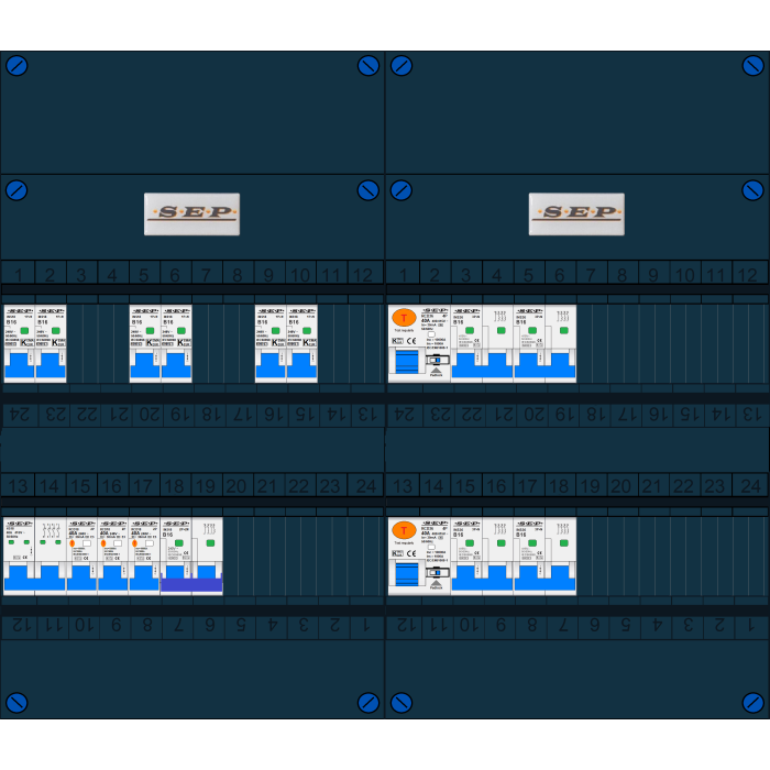 SEP groepenkast, hoofdschakelaar, 3x aardlekschakelaar 2p/40/30mA, 2x aardlekschakelaar 4p/40A/30mA, 6x installatieautomaat 1p+n/B16, 4x Installatieautomaat 3p+n/B16, kookgroep 2p+2n/B16 (3 fase)