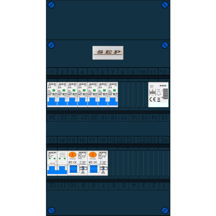 SEP groepenkast, hoofdschakelaar, 2x aardlekschakelaar 4p/40A/30mA, 7x installatieautomaat 1p+n/B16, beltrafo (3 fase)
