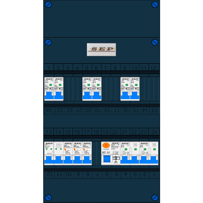 SEP groepenkast, hoofdschakelaar, 3x aardlekschakelaar 2p/40A/30mA, 1x aardlekschakelaar 4p/40/30mA, 6x installatieautomaat 1p+n/B16, 2x installatieautomaat 3p+n/B16 (3 fase)