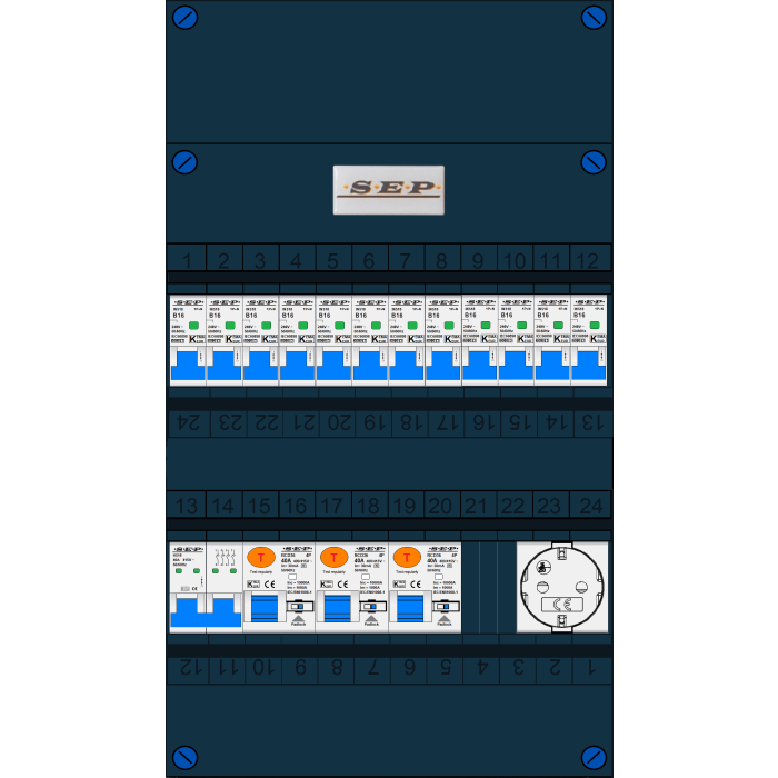 SEP groepenkast, hoofdschakelaar, 3x aardlekschakelaar 4p/40A/30mA, 12x installatieautomaat 1p+n/B16, enkelvoudige contactdoos (3 fase)