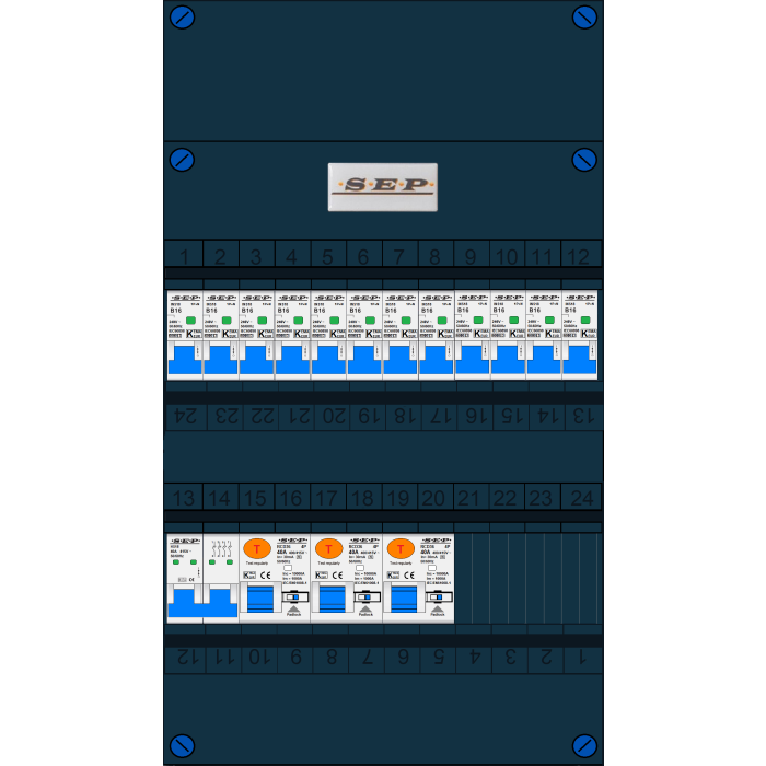 SEP groepenkast, hoofdschakelaar, 3x aardlekschakelaar 4p/40A/30mA, 12x installatieautomaat 1p+n/B16 (3 fase)