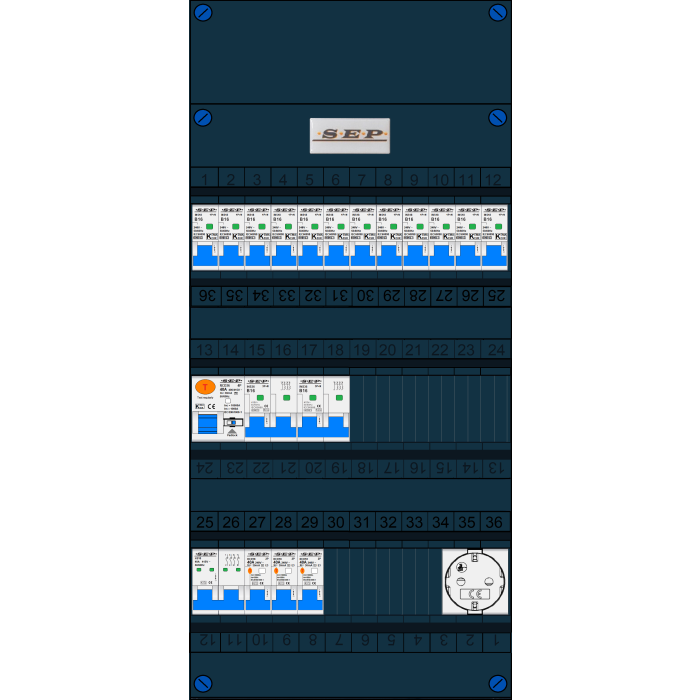 SEP groepenkast, hoofdschakelaar, 3x aardlekschakelaar 2p/40/30mA, 1x aardlekschakelaar 4p/40A/30mA, 12x installatieautomaat 1p+n/B16, 2x installatieautomaat 3p+n/B16, enkelvoudige contactdoos (3 fase)