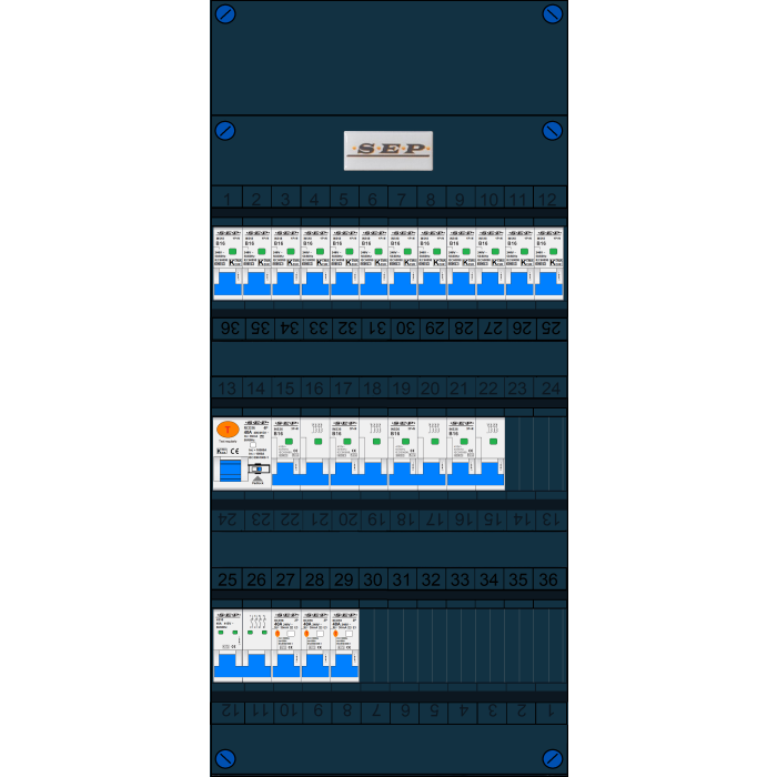 SEP groepenkast, hoofdschakelaar, 3x aardlekschakelaar 2p/40/30mA, 1x aardlekschakelaar 4p/40A/30mA, 12x installatieautomaat 1p+n/B16, 4x Installatieautomaat 3p+n/B16 (3 fase)