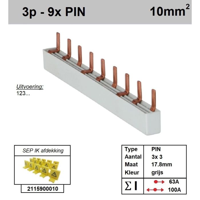 Geïsoleerde doorverbindingskam, 3 fase, 9x PIN, 10mm2, 17,8mm