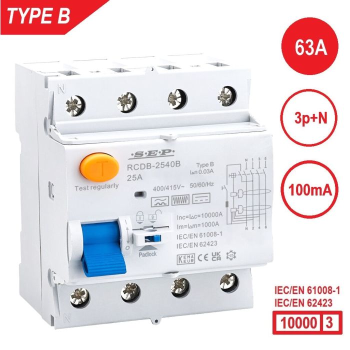 SEP aardlekschakelaar type B, 63Amp, 100mA, 10kA kan worden toegepast als 1p+n en 3p+n. Beveiliging AC+A+B type aardlekfout stromen.