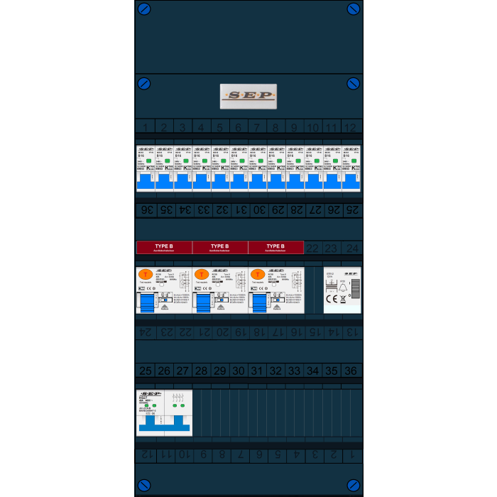 SEP NOVA-B groepenkast (3 fasen), 1x Hoofdschakelaar 4p/40A, 3x Aardlekschakelaar 2p/40A/30mA type B, 12x automaten 1p+n/B16, beltrafo