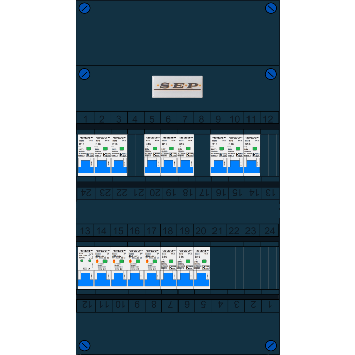 SEP groepenkast, hoofdschakelaar, 4x aardlekschakelaar, 12x installatieautomaat (1 fase)