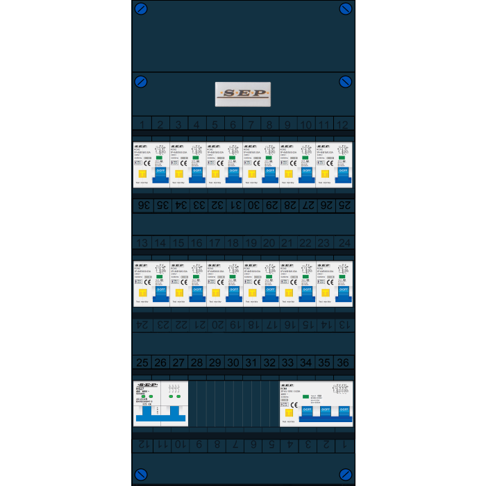 SEP Groepenkast, hoofdschakelaar, 12x Aardlekautomaat B16/30mA, 1x kracht-aardlekautomaat B16/30mA (3 fasen)